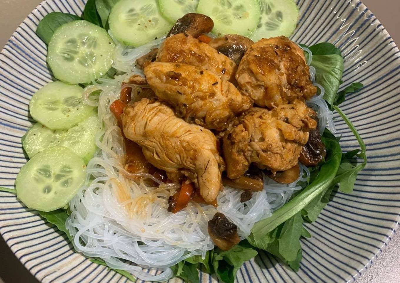 Mettre à tremper les vermicelles de soja (voir indications sur le paquet) - Préparer le bowl en plaçant la salade puis le concombre, les vermicelles tièdes au centre, puis le poulet