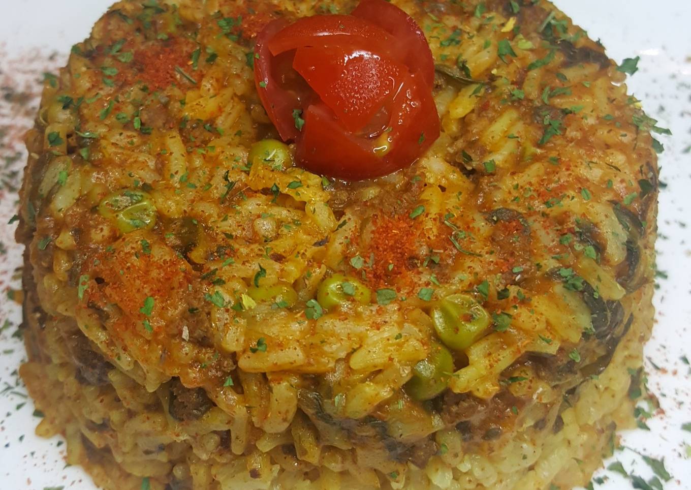 Riz à la viande et petits légumes