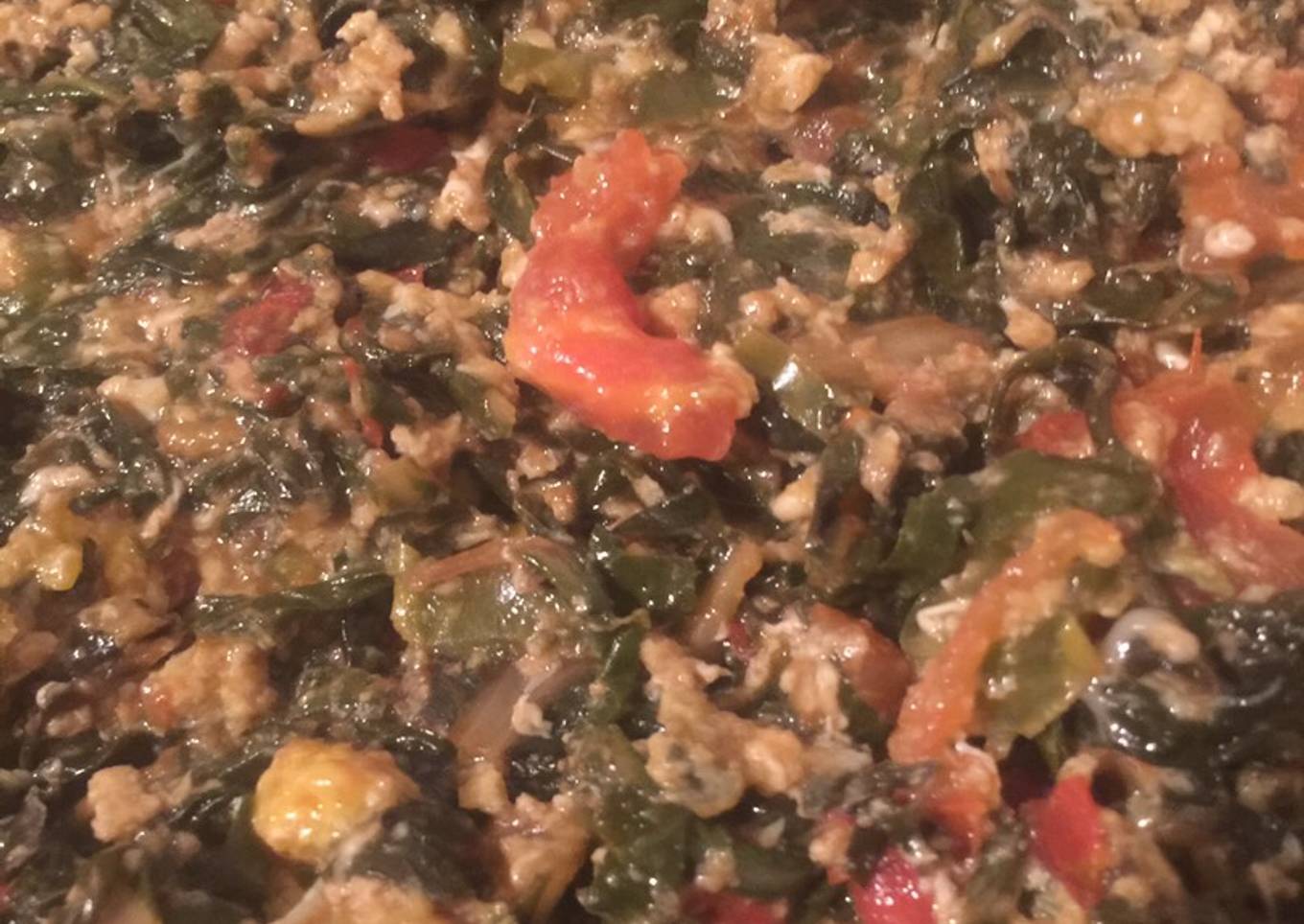 - Ajouter l’ail tomates et piments et cuire incorporer les blettes mélanger et ajouter les œufs une après l’autre saler et poivrer