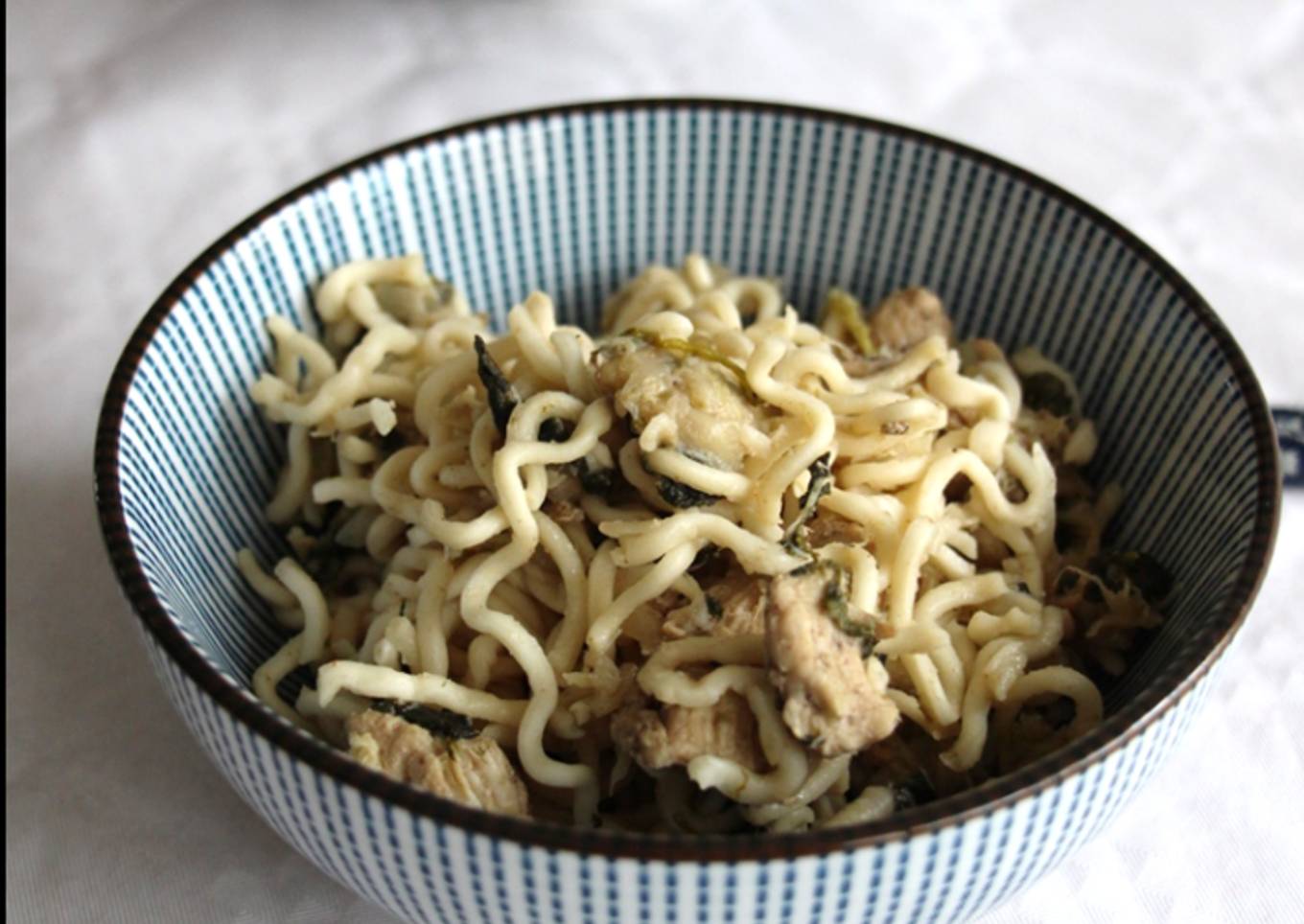 - Dans un gros faitout, faites sauter le poulet avec la marinade. Ajoutez le chou coupé en fines lanières, les pousses d'épinard bien rincées, l'oignon haché finement et le reste de sauce soja. Quand le chou est cuit ajoutez les pâtes et bien mélanger.
