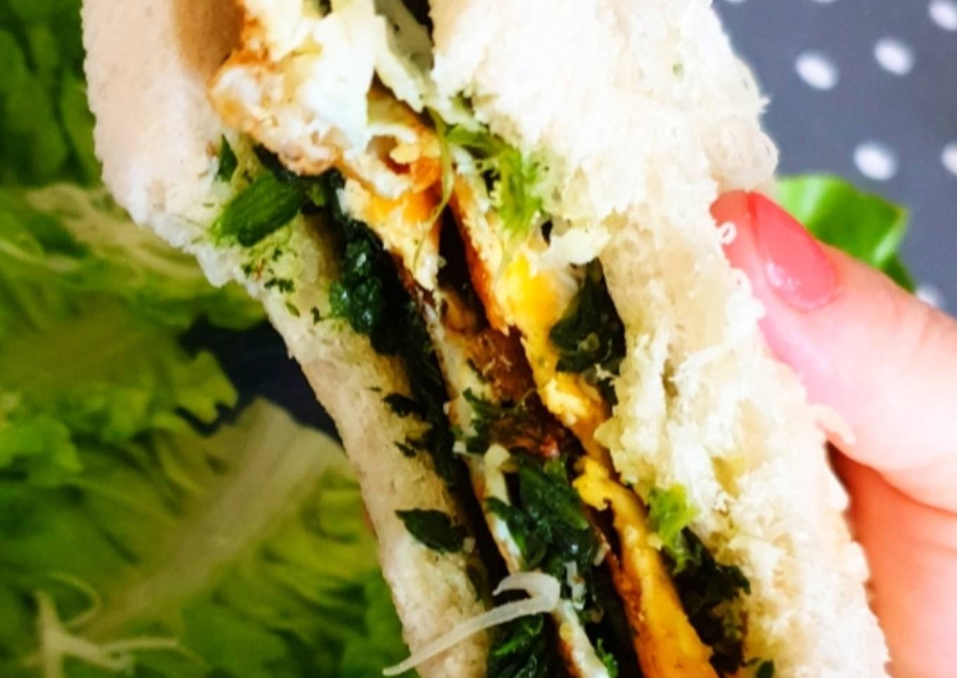 - Poser sur 1 tranche de pain, 1 lèger filet d'huile puis la moitié des épinards, la moitié de l'oeuf, l'autre moitié des épinards, de l'oeuf et l'emmental