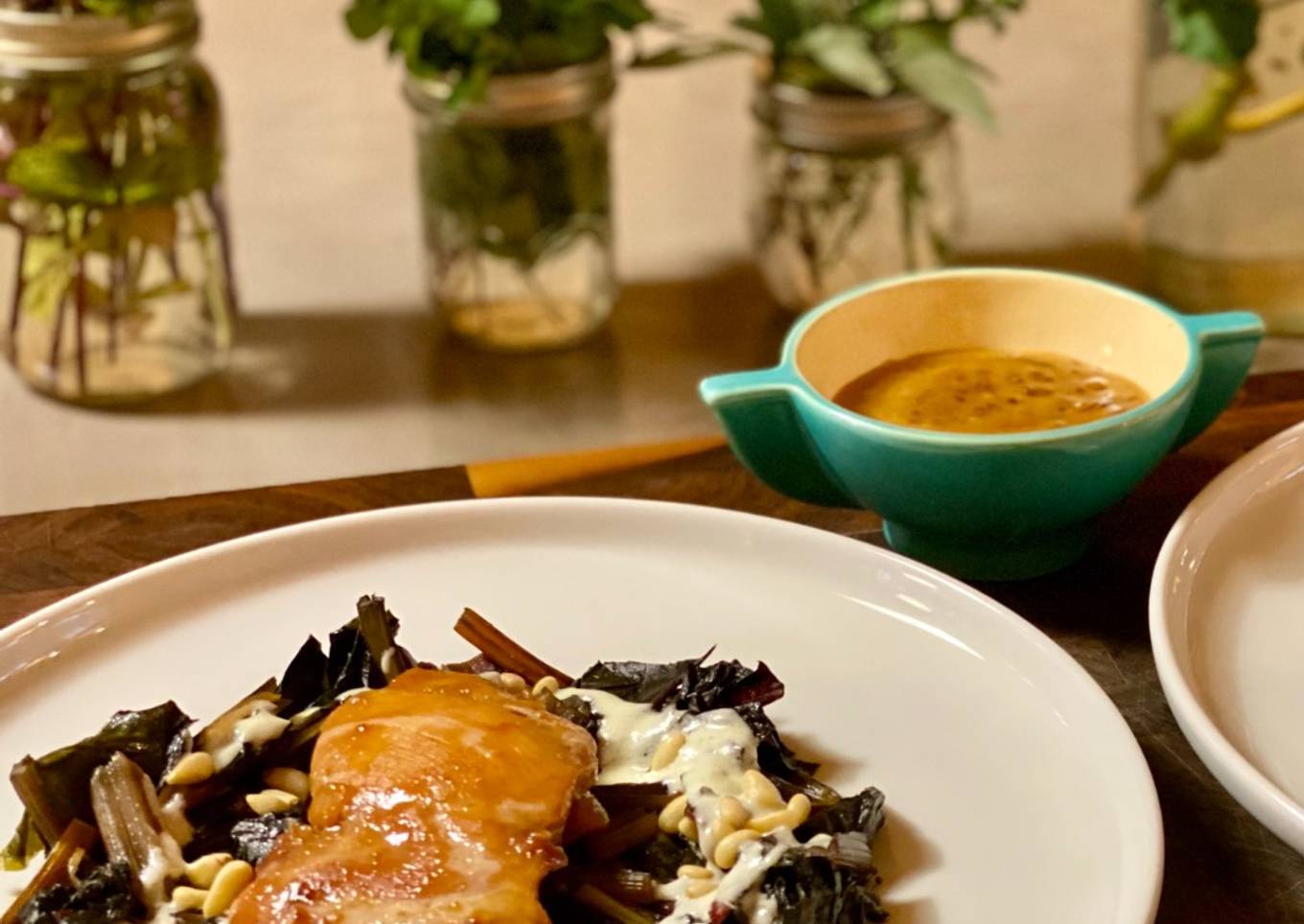 Ce que j’aime dans cette plante c’est d’abord son goût puis sa couleur fushia, hélas à la cuisson souvent elle disparait un peu. Je la cuisine presque comme des épinards. Pour l’accompagner, des hauts de cuisse de poulet marinés pour avoir une bonne sauce sucrée-salée qui ira bien avec les bettes.