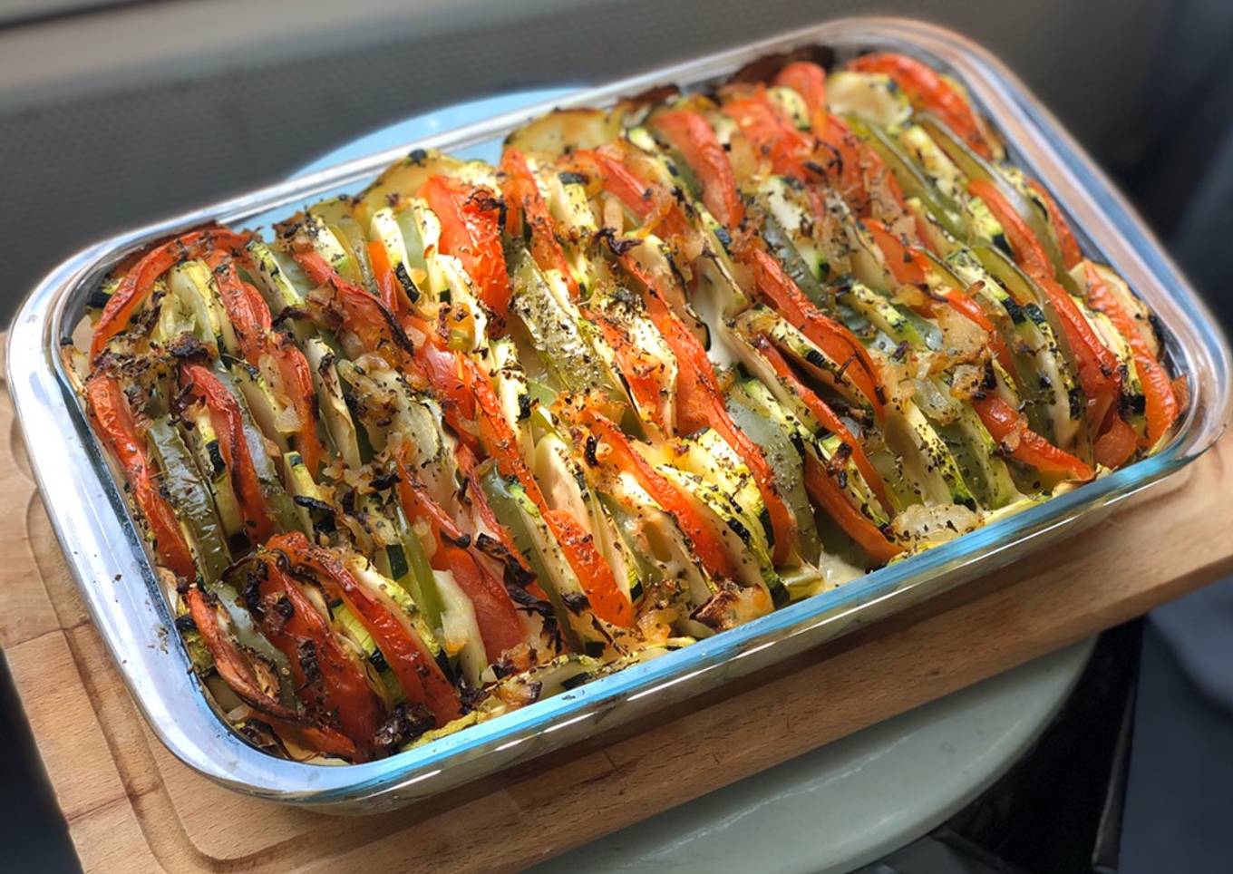 - Préchauffez le four à 180 degré. Intercalez ensuite les rondelles de courgette, tomate, poivron et mozzarella sur tout le dessus du plat.