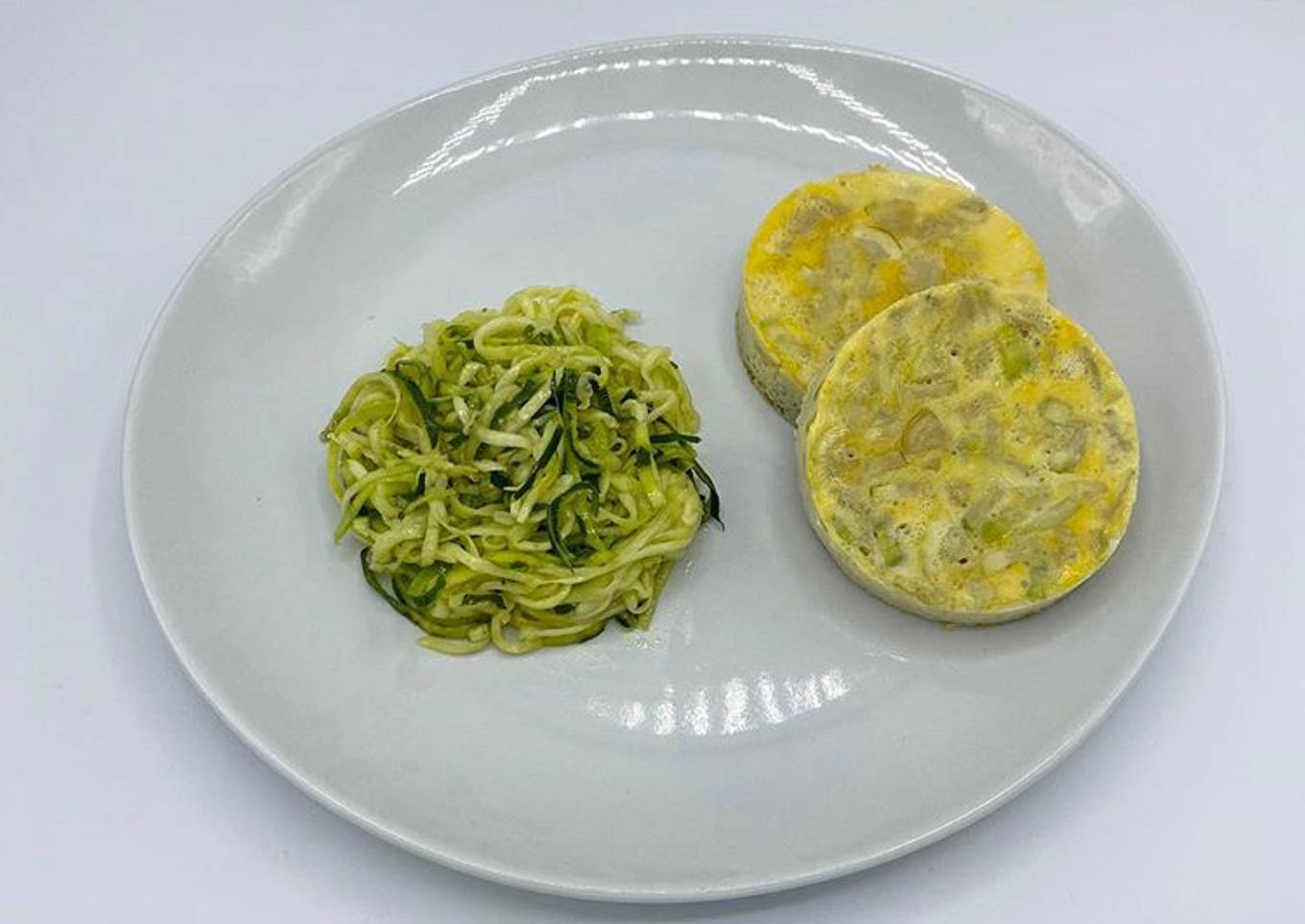 - Laver, sécher puis, couper les extrémités des courgettes. Couper la moitié des courgettes en petit dés puis le reste en spaghettis. Dans un bol, battre les œufs en omelette avec 10cl de crème fraîche liquide et les épices. Éplucher puis, à l’aide d’un presse ail, presser les gousses. Dans une première poêle, faire revenir l’ail dans 1 cuillère à soupe d’huile d’olive pendant 5 minutes. Ajouter les spaghettis de courgettes et les faire revenir tout en mélangeant pendant 10 à 15 minutes.