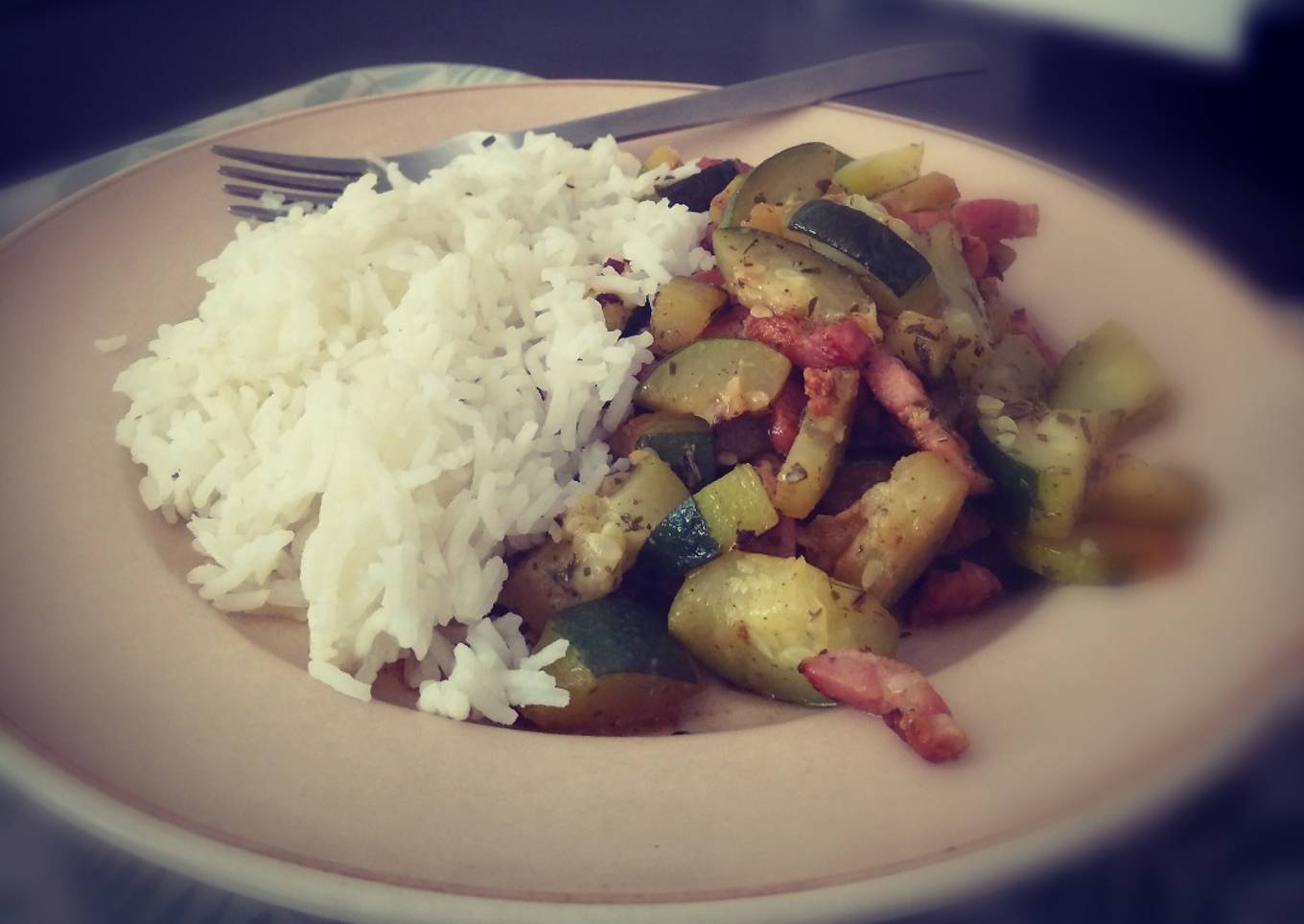 Courgette, lardons, riz basmati